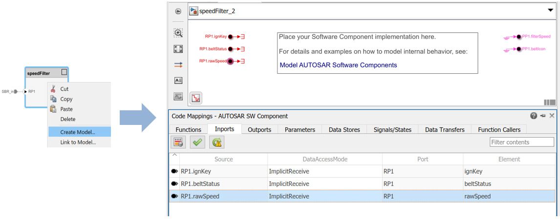 架构创建完成并确认后,可以从架构组件关联已有的Simulink设计模型或直接创建新的设计模型。设计模型以自动继承架构模型端口的方式实现了接口控制,并自动创建AUTOSAR属性词典及其与Simulink的映射。