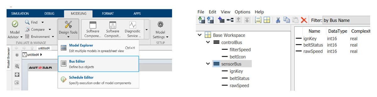 在菜单栏的Design Tools下打开Bus Editor定义总线类型,这一步对应AUTOSAR的接口定义(如有需要可在Simulink数据词典或工作空间中预先定义所需AUTOSAR数据类型)。