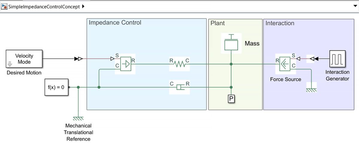 En examinant de près l’équation, l’action de contrôle du régulateur PD peut être interprétée physiquement comme une combinaison ressort-amortisseur, où le terme proportionnel représente le ressort et le terme dérivé représente l’amortisseur. Il s'agit d'un contrôleur d'impédance simple qui non seulement déplace la masse vers la position souhaitée, mais injecte également une impédance définie dans le système qui peut être ressentie lors de toute interaction externe avec le système (Figure 1).
