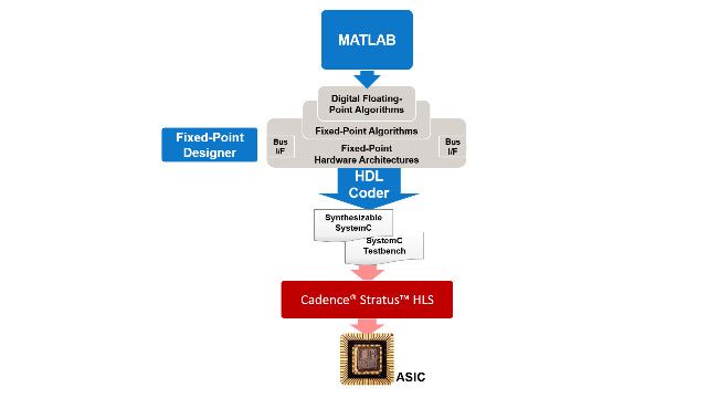 You can generate synthesizable SystemC™ from MATLAB functions. The generated SystemC can serve as an input to the Cadence® Stratus™ High-Level Synthesis tool. Through the integration of Stratus HLS with the Genus logic synthesis solution and the Joules RTL power solution, ASIC designers get early visibility on the PPA of ASIC design implementations.