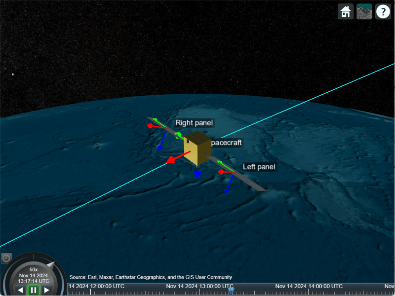 leftPanel = satellite(sc,leftPanelPosition,Name="Left panel"); leftPanel.Visual3DModel = 'leftPanel.glb'; rightPanel = satellite(sc,rightPanelPosition,Name="Right panel"); rightPanel.Visual3DModel = 'rightPanel.glb';