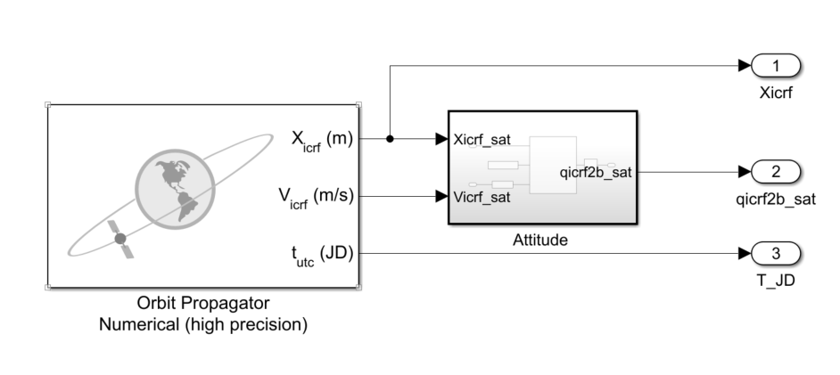 The Planetary Ephemeris block outputs the position of the Sun relative to Earth in the ICRF. This subsystem requires the input to be the barycentric dynamical time (TDB), but the example inputs the UTC time. Because the Sun is about 150 million kilometers away and the difference between UTC and TDB is about 69 seconds, the mispointing error of the solar panels is negligible at 0.001 degrees.