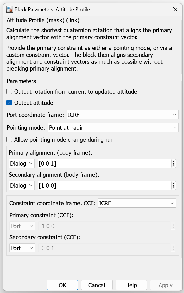 The desired attitude is nadir pointing, with the spacecraft body-z axis pointing nadir and the body-x axis aligning with the ICRF velocity vector. Therefore, the primary alignment vector is the body-z axis, the primary constraint vector is the unit vector pointing towards nadir, the secondary alignment vector is the body-x axis, and the secondary constraint vector is the unit vector along the ICRF velocity direction. Accordingly, the Pointing mode parameter of the Attitude Profile block is set to "Point at nadir", automatically setting the primary constraint vector to the nadir direction. The primary and the secondary alignment vectors are set to the body-z and x axes, respectively. The secondary constraint vector, the unit ICRF velocity vector, is input through the port .
