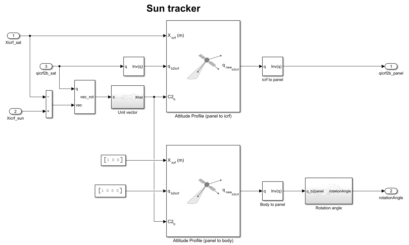 The Attitude Profile (panel to body) block is configured similarly to the Attitude Profile (panel to icrf), except the input is set to an arbitrary vector and the input is set to the identity quaternion.The block outputs the quaternion that relates the satellite and panel body frames. The Rotation angle subsystem then deduces the rotation angle for the panels from this quaternion.