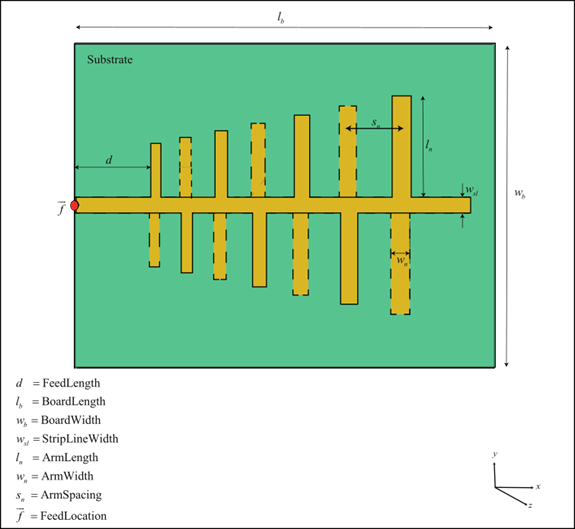 centered at the origin and uses an FR4 substrate. This antenna is widely used in