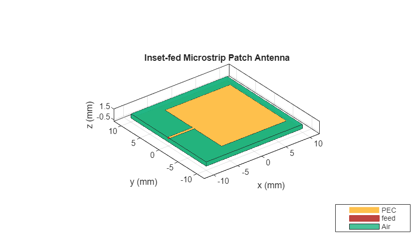 While it is possible to model this antenna using a pcbComponent object, the patchMicrostripInsetfed object straightforwardly constructs most of the geometry required. There are two caveats: first, the antenna is edge-fed instead of probe-fed, and second, there is a requirement to add a very small notch where the feed trace touches the patch to satisfy the patchMicrostripInsetfed object's assumptions. Nevertheless, it gives a good first estimate of the input impedance.