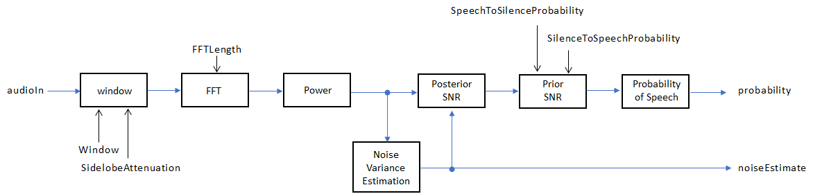 If InputDomain is specified as 'Time', the input signal is windowed and then converted to the frequency domain according to the Window, SidelobeAttenuation, and FFTLength properties. If InputDomain is specified as frequency, the input is assumed to be a windowed discrete time Fourier transform (DTFT) of an audio signal. The signal is then converted to the power domain. Noise variance is estimated according to [2]. The posterior and prior SNR are estimated according to the Minimum Mean-Square Error (MMSE) formula described in [3]. A log likelihood ratio test and Hidden Markov Model (HMM)-based hang-over scheme determine the probability that the current frame contains speech, according to [1].