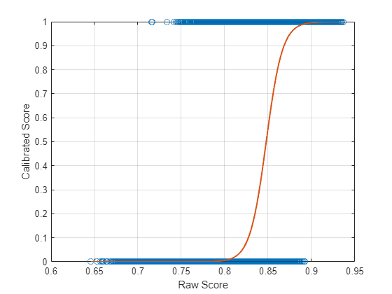 plot(x,trueLabel,"o") hold on plot(scoringMap.Raw,scoringMap.Calibrated,LineWidth=1.5) grid on xlabel("Raw Score") ylabel("Calibrated Score") hold off