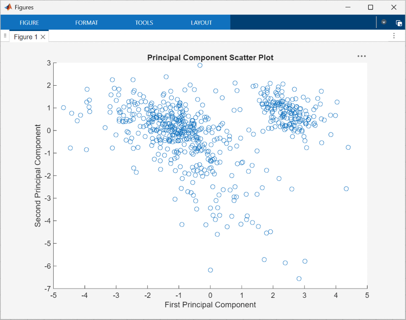 Visualize the principal components using the scatter function, specified in the UserFunction block PlotPCA, which generates the following figure:
