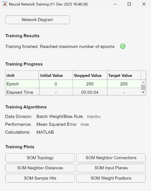 The UserFunction block ViewSOM calls the view function on the generated SOM for an overview of the network's architecture.