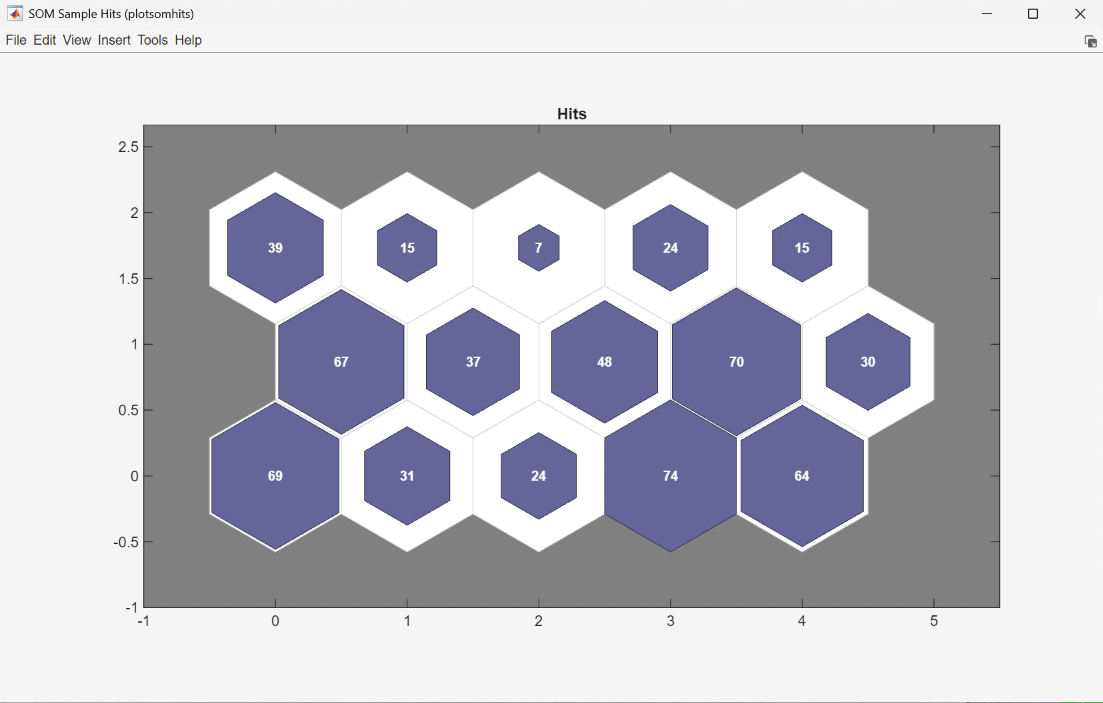Finally, use plotsomhits to see how many vectors are assigned to each of the neurons in the map, within the UserFunction block PlotSOMHits.