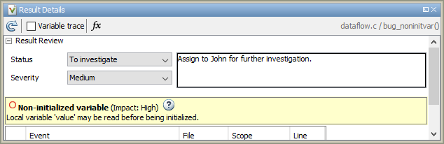 Dans le volet Result Details, la séquence d’événements conduisant au résultat est mise en surbrillance. Par exemple, dans le cas du résultat Non initialized variable, vous voyez les événements suivants :