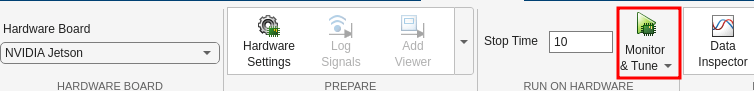 In the Simulink Toolstrip, on the Hardware tab, click Monitor & Tune. This deploys the model on the target hardware and runs the model in external mode.