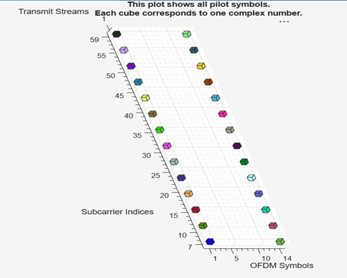 plot(pilotcfg) returns a 3-D plot of all pilot locations given in the pilotcfg input. Each cube represents one pilot symbol. Cubes of the same color in the plot show pilot symbols that form orthogonal vectors along the stream axis.