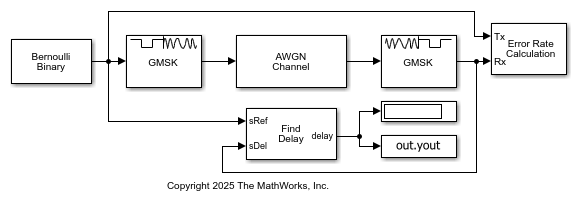 The Error Rate Calculation block has the receive delay set to the value of the traceback depth used by the GMSK Baseband Demodulator block. The model uses the Find Delay block to confirm the delay equals the value of the traceback depth.