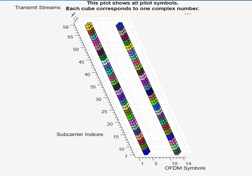 pilotcfg = ofdmPilotConfig with properties: FFTLength: 64 NumGuardBandCarriers: [2×1 double] NumSymbols: 14 NumTransmitStreams: 2 StreamGroups: {[1 2]} PilotLocations: {[2×2×52 double]} PilotSymbols: {[2×2×52 double]}StreamGroups: {[1 2]}value shows that both streams are grouped together. At each pilot location, both streams transmit pilot symbols at the same time and frequency, but with different orthogonal values.PilotLocations: {[2-by-2-by-52 double]}is a 3-D array showing the placement of pilot symbols. First dimension is the number pilot locations per cluster. Each location is a [subcarrier;symbol} pair. Second dimension is always 2 representing a two-element coordinate where one coordinate is the subcarrier index and the other coordinate is OFDM the symbol index. Third dimension is the number of clusters.PilotSymbols: 2-by-2-by-52 doubleis a 3-D array of the actual pilot values. First dimension is the number of pilot symbols per cluster. Second dimension is the number of streams per group. Third dimension is the number of clusters. Each cluster has a 2-by-2 matrix of complex pilot values. Each column corresponds to a stream, and each row to a pilot in the cluster. These are chosen so that, in each cluster, the pilots sent by the two streams are orthogonal.