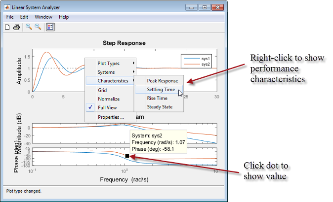 Analysez les performances du système. Par exemple, vous pouvez analyser le gain maximal dans le diagramme de Bode et le temps de stabilisation dans le diagramme de réponse indicielle.