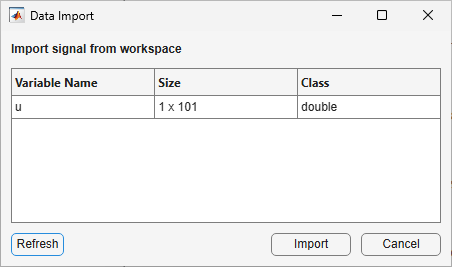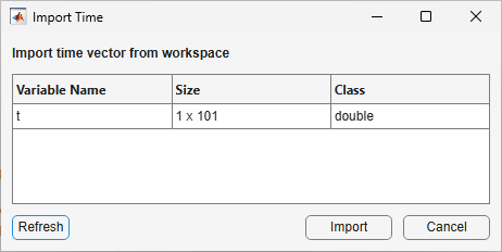 In the Data Import dialog box, the table shows any variables in the MATLAB workspace that are row or column vectors and that have a length equal to the number of samples in your specified time vector.