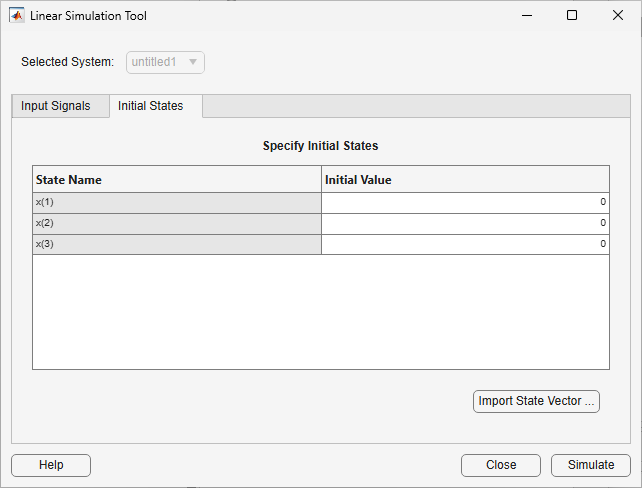 Use the Linear Simulation Tool to specify input signals and initial conditions for simulating linear models with arbitrary input signals and initial conditions.