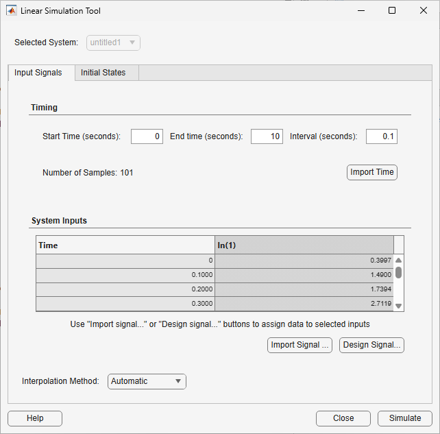 Also, the System Inputs table shows the specified time vector in the first column. The remaining columns correspond to the input signals for your dynamic system model.