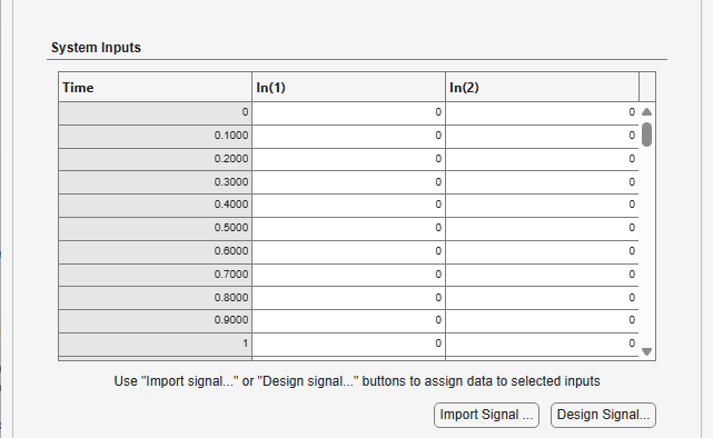On the Input Signals tab, the System Inputs table shows the specified time vector in the first column. The remaining columns contain the input signals for your dynamic system model. The number of columns equals the number of model inputs.