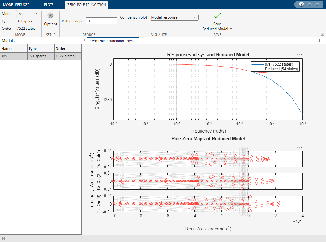 To launch zero-pole truncation, on the Model Reducer tab, click Zero - Pole Truncation.