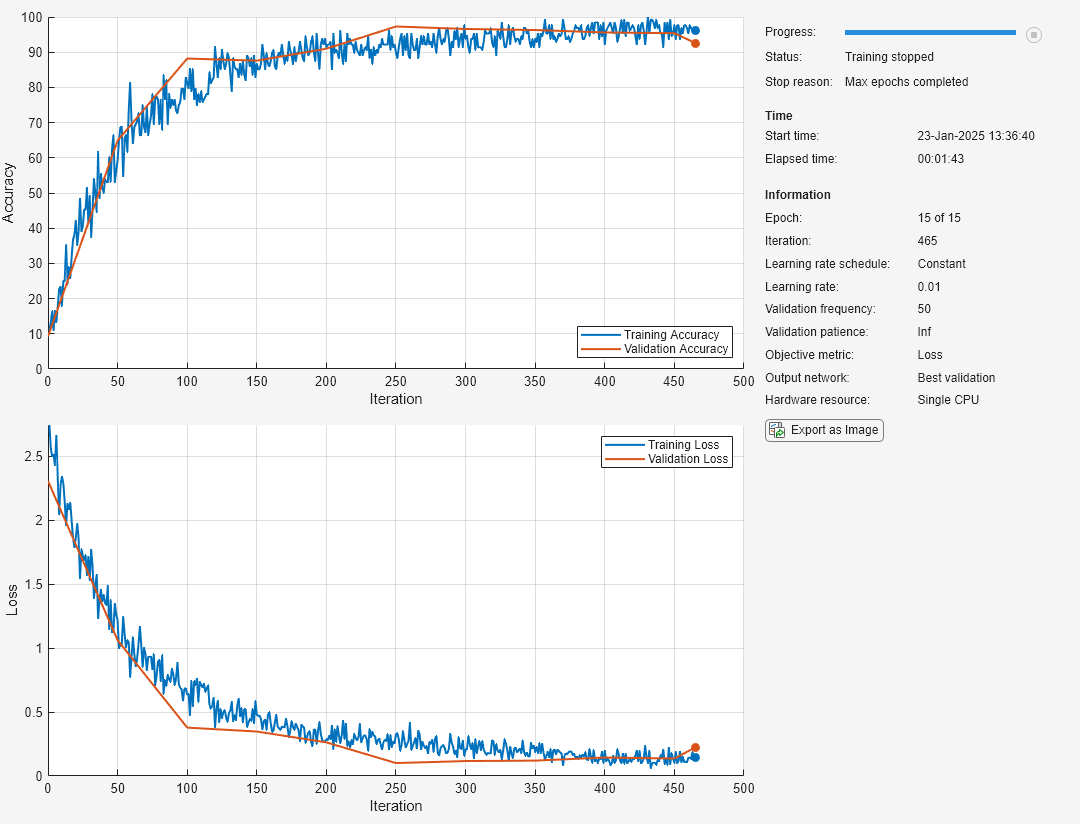 imageInputLayernormalise les images selon la moyenne des images augmentées et non la moyenne du jeu de données d’origine. Cette moyenne est calculée une seule fois pour le premier epoch augmenté. Tous les autres epochs utilisent cette même moyenne pour que l’image moyenne ne change pas en cours d’apprentissage.Utilisez un datastore d'images augmentées pour prétraiter efficacement les images pour le Deep Learning, y compris en les redimensionnant. N’utilisez pas l’option