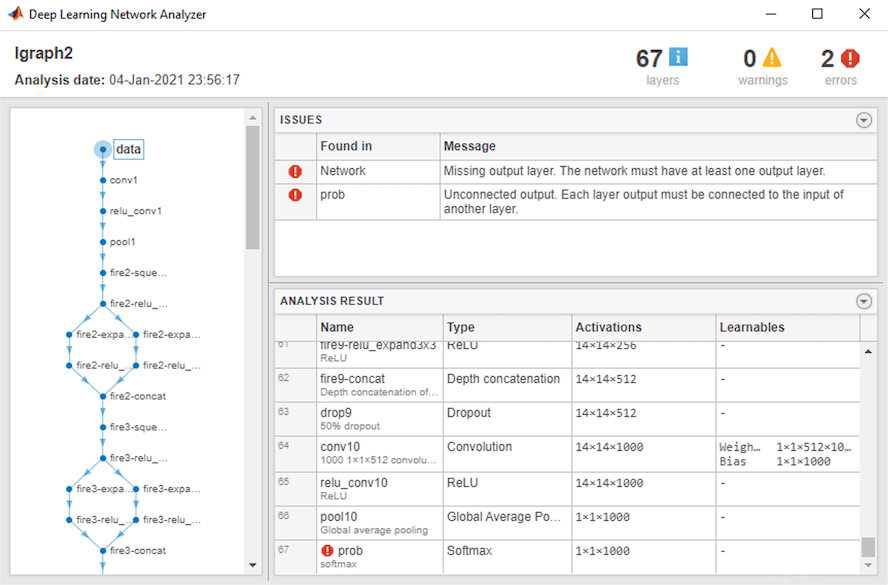 analyzeNetwork displays an interactive plot of the network architecture and a table containing information about the network layers. You can also detect errors and issues in the network net before exporting it to the ONNX format. net is error free.