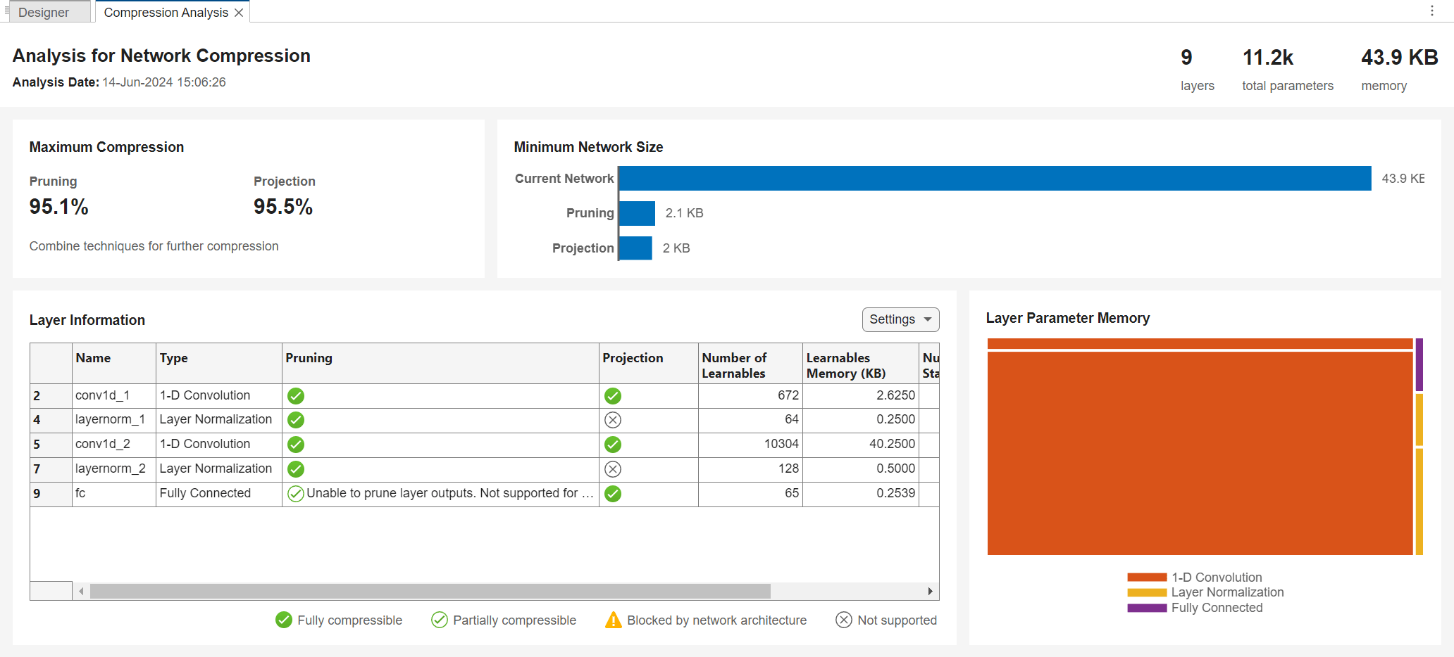 Get a report on how much compression pruning or projection of the network can achieve by clicking the Analyze for Compression button in the toolstrip.