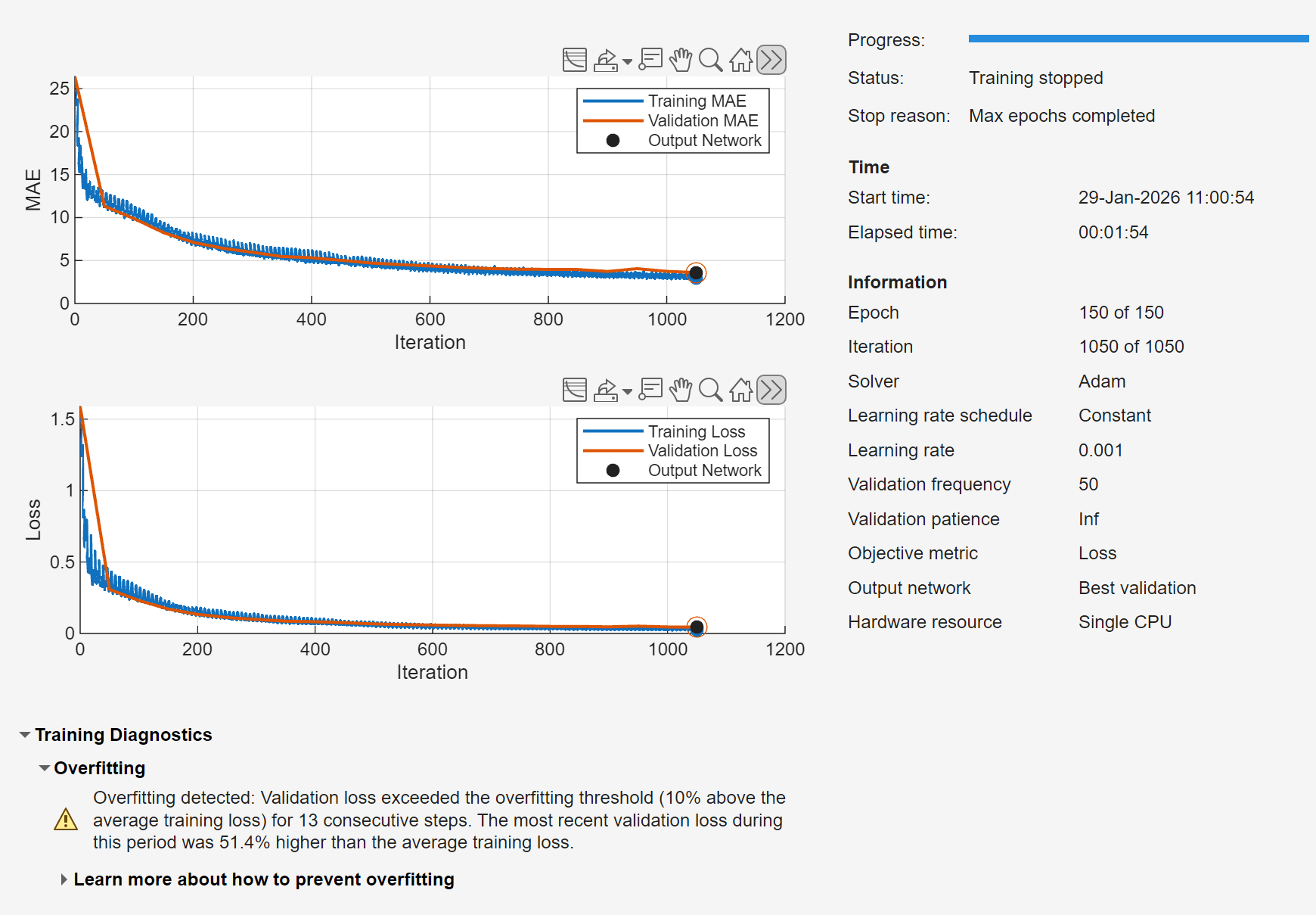 Small transformers, like the one used in this example, train fast on a GPU. This custom network also has a better validation root mean squared error (RMSE) compared to the default LSTM. If you have sufficient amount of data, use a transformer network as it usually outperforms simpler options such as MLP or LSTM, and is usually faster to train than an LSTM.