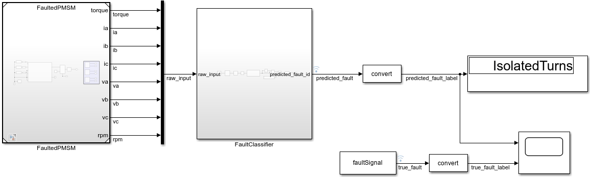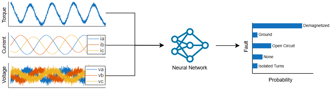 This example shows how to train a deep learning model to classify faults in a permanent magnet synchronous motor (PMSM) using simulated data across various revolutions per minute (RPM). You use Simscape Electrical™ to create the model for a fault scenario, then use Deep Learning Toolbox™ to train a neural network to classify the fault data.