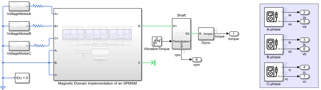 The PMSM model in this example is a three-phase, inrunner, radial-flux surface permanent magnet synchronous motor (SPMSM) with ten rotor poles and nine stator winding slots. This model is adapted from the model in the Faulted PMSM (Simscape Electrical) example.