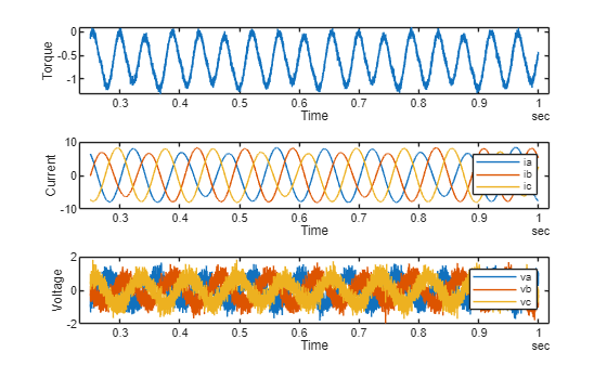 firstRPMData = load("FaultData\FaultedPMSMResults" + speedValuesRPM(1) + "RPM"); exampleGeneratedData = firstRPMData.Demagnetized_ResultsInSIUnits; tiledlayout(3,1) nexttile plot(exampleGeneratedData,"torque") ylabel("Torque") nexttile plot(exampleGeneratedData,["ia","ib","ic"]) ylabel("Current") legend nexttile plot(exampleGeneratedData,["va","vb","vc"]) ylabel("Voltage") legend