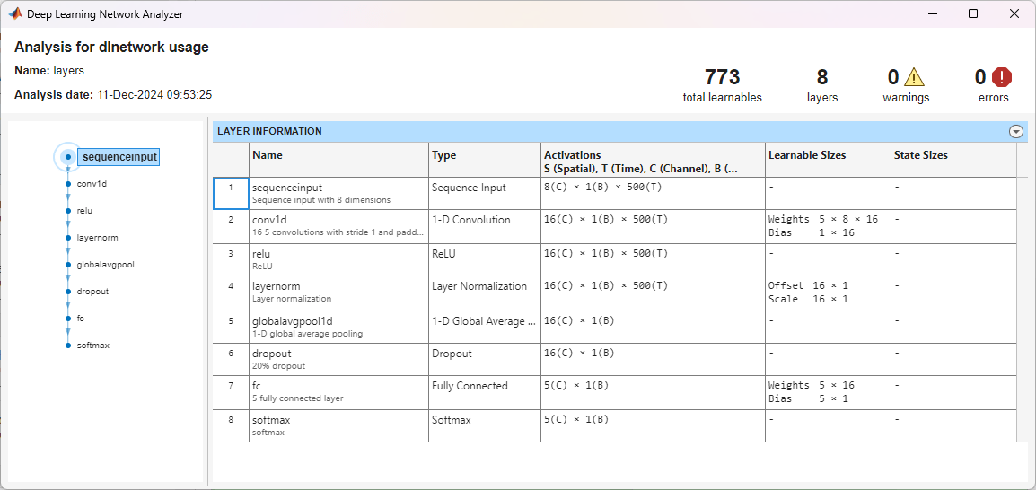 numFeatures = 8; numClasses = 5; layers = [ ... sequenceInputLayer(numFeatures,MinLength=frameSize,Normalization="zscore") convolution1dLayer(5,16,Padding="same") reluLayer layerNormalizationLayer globalAveragePooling1dLayer dropoutLayer(0.2) fullyConnectedLayer(numClasses) softmaxLayer];