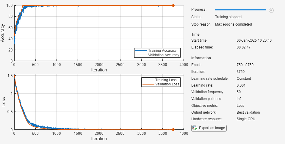 options = trainingOptions("adam", ... MaxEpochs=750, ... Verbose=0, ... Shuffle="every-epoch", ... Plots="training-progress", ... ValidationData={XVal,YVal}, ... Metrics = "accuracy");