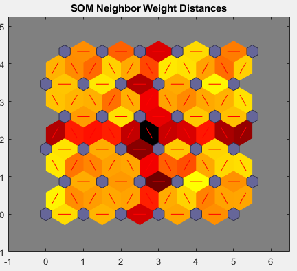 When the input space is high dimensional, you cannot visualize all the weights at the same time. In this case, click SOM Neighbor Distances. The following figure appears, which indicates the distances between neighboring neurons.