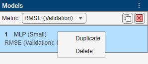 To increase the model accuracy, increase the number of training epochs. Make a copy of the MLP model by right-clicking it in the model list and selecting Duplicate.