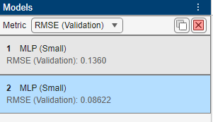 To compare the performance of the models, see the RMSE in the Models list. The LSTM takes longer to train, but has a smaller RMSE.