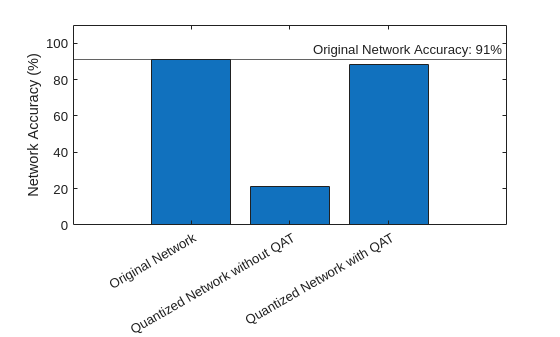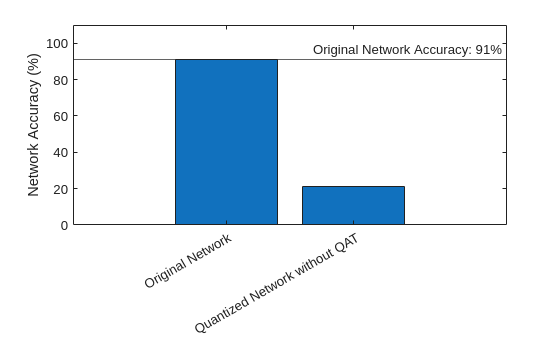 Quantize and evaluate the accuracy of the network before QAT to get a baseline performance for the fixed-point version of the network. The createQuantizedNetwork supporting function performs the same quantization workflow and is the function you use to quantize networks throughout the rest of the example.