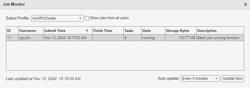 You can see the current status of your job in the cluster by checking the Job Monitor. In the Environment section on the Home tab, select Parallel > Monitor Jobs to open the Job Monitor.
