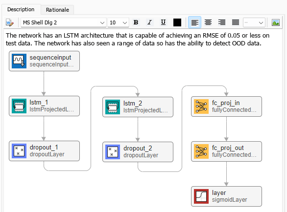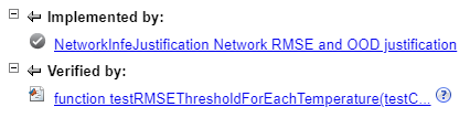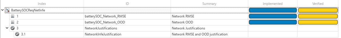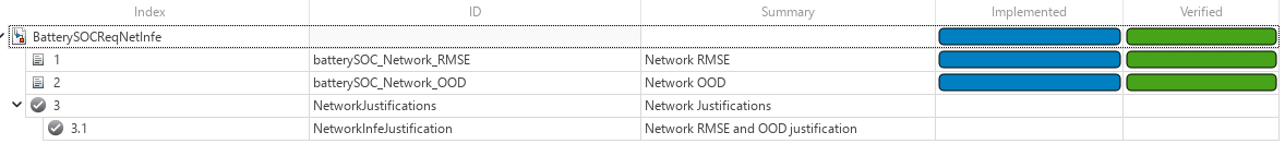 By creating a network capable of achieving the required RMSE value, you have implemented the requirements. You can see this justification by selecting NetworkInputOutputJustification in the requirements editor.