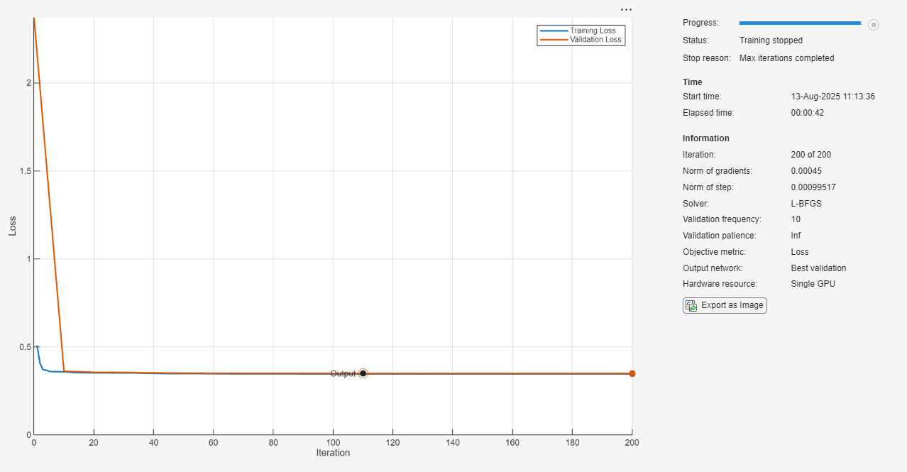 options = trainingOptions("lbfgs", ... MaxIterations=200, ... ValidationData={XValidation,TValidation}, ... ValidationFrequency=10, ... Plots="training-progress", ... Verbose=false);