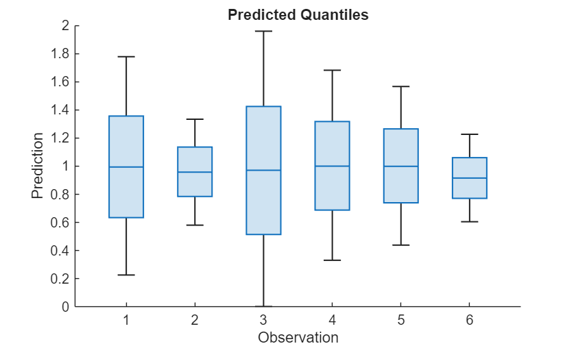figure boxchart(YNew') xlabel("Observation") ylabel("Prediction") title("Predicted Quantiles")