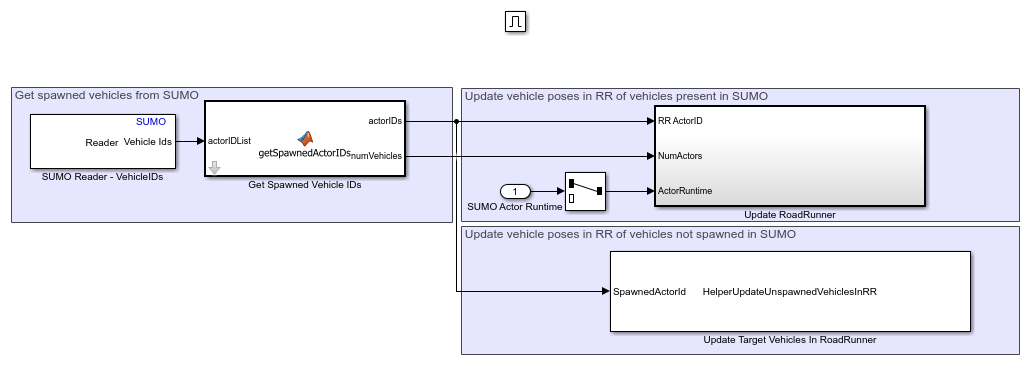 The HelperConvertRRPoseToSUMO System object converts the positions of RoadRunner vehicles to the SUMO coordinate system, and the Update RoadRunner Vehicles subsystem updates them in SUMO. Open the Update RoadRunner Vehicles subsystem.