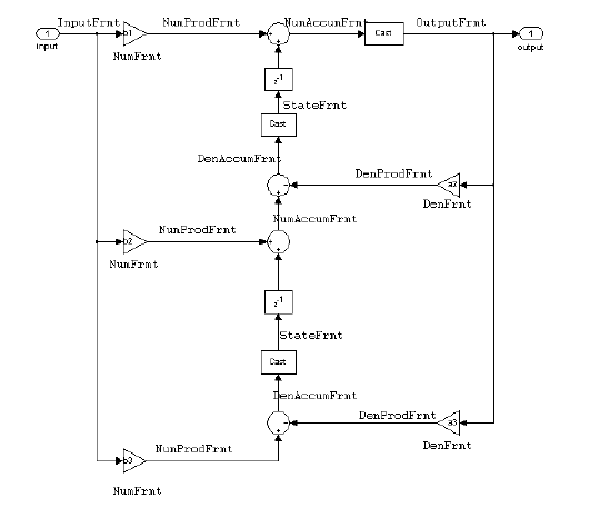 | Describes the signal flow for the filter object, including all of the active elements that perform operations during filtering—gains, delays, sums, products, and input/output. |