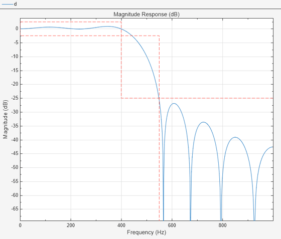 Generate MATLAB function>Digital Filter Object. The code appears in the editor.function designedFilter = lowpassfir1filt designedFilter = designfilt('lowpassfir', ... 'PassbandFrequency',400,'StopbandFrequency',550, ... 'PassbandRipple',5,'StopbandAttenuation',25, ... 'SampleRate',2000,'DesignMethod','kaiserwin', ... 'MinOrder','Even','ScalePassband',false); end