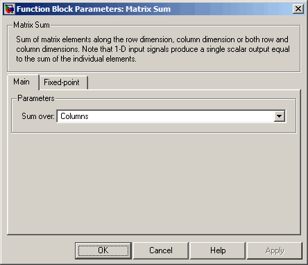 When the Sum over parameter is set to Columns, the block sums down the elements of each column and outputs the resulting 1-by-N matrix. A length-M 1-D vector input is treated as a M-by-1 matrix.