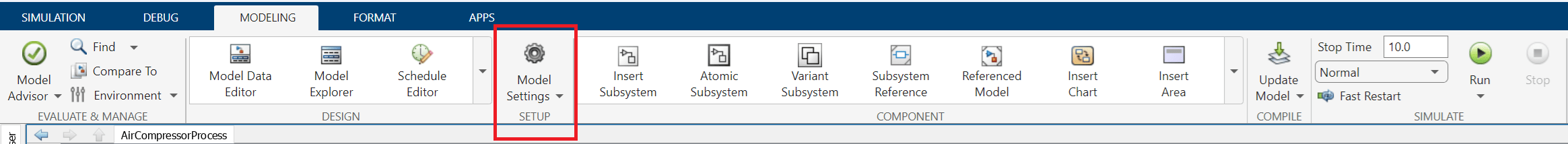 • In the Apps tab of the Simulink model toolstrip, click the Embedded Coder app. In the C Code tab that opens, click Settings.