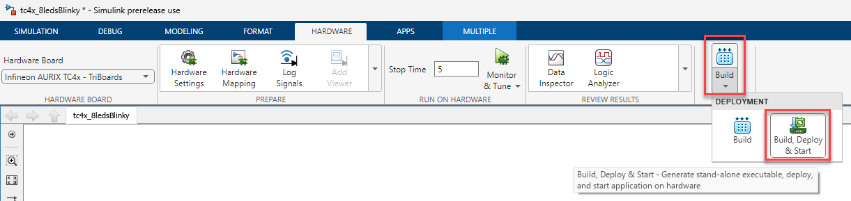 2. To generate code for the model, go to Hardware tab > Build and select Build, Deploy & Start.
