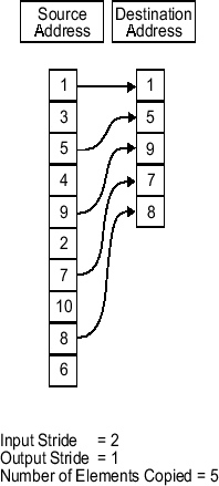 Specify the spacing between the elements when writing the output data. A stride value equal to one means that the generated code writes the input data sequentially to the destination in consecutive locations. When you add a stride value that is more than 1, the output data is stored not sequentially, but skips elements equal to the stride.